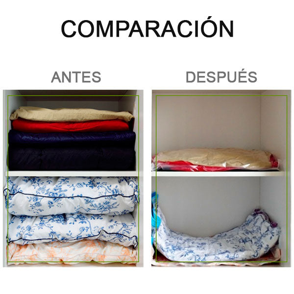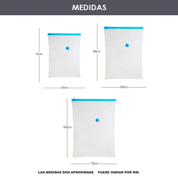 - MULTIFUNCIONALES - Gracias a sus tres tamaños diferentes, permiten resguardar todo tipo de objetos. No solamente la ropa durante un viaje, sino también las colchas, sábanas, almohadas, mantas y otras prendas para el hogar. Ahorra hasta un 80% de espacio en un armario o maleta.