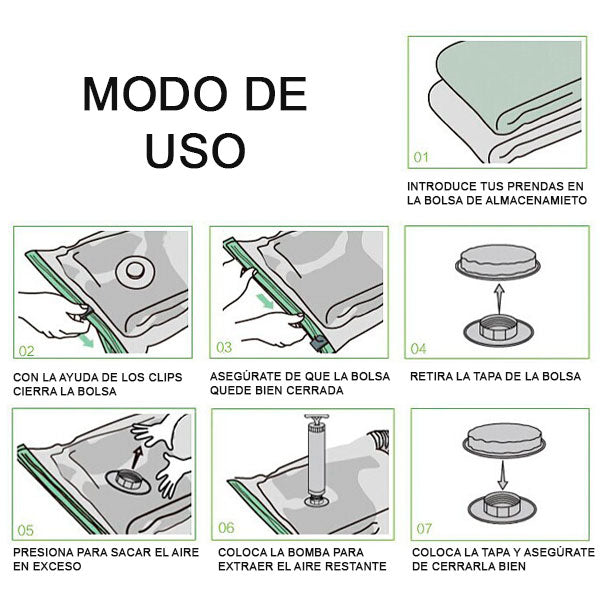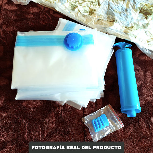 - CONTENIDO DEL PAQUETE:2 Bolsas grandes2 Bolsas medianas4 Bolsas chicas1 Bomba de aire4 Clips para sellar las bolsas